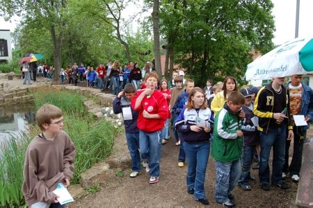 erlebnisorientierter Pausenhof mit Labyrinth, Teich, Bolzplatz, Kletterfelsen und römischen Theater