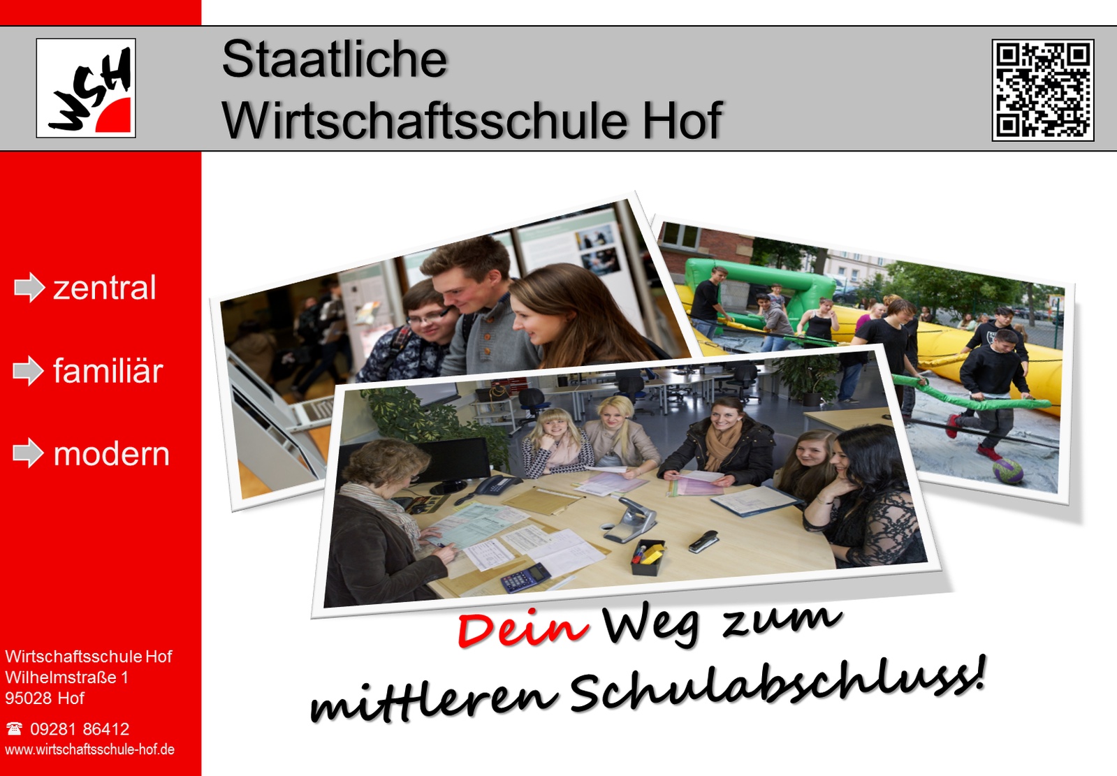 Die Wirtschaftsschüler werden durch allgemeinbildende Fächer und Profilfächer gezielt auf die moderne Arbeitswelt und deren Anforderungen vorbereitet. Das Alleinstellungsmerkmal der Wirtschaftsschule ist das Fach Berufliche Praxis (Simulation und Praktikum). Hier führen die Schülerinnen und Schüler die kaufmännischen Tätigkeiten eines Großhandelsunternehmens zunehmend selbständig aus und erhalten dadurch und durch ihr 20-tägiges Praktikum einen Praxisbezugs, der später in jedem Beruf von großem Nutzen sein wird. Die Wirtschaftsschule bietet aber nicht nur für kaufmännische Ausbildungsberufe eine gute Grundlage, sondern bereitet optimal auf alle anderen Ausbildungsberufe vor. Seit diesem Schuljahr bieten wir wieder Spanisch als Wahlfach an. Der Wirtschaftsschulabschluss ist zudem die Basis für andere, weiterführende Abschlüsse bis hin zur Hochschulreife. Die enge Zusammenarbeit mit der Fachoberschule im organisatorischen Verbund des Beruflichen Schulzentrums Hof II garantiert hier einen in der Regel problemlosen Übergang.
